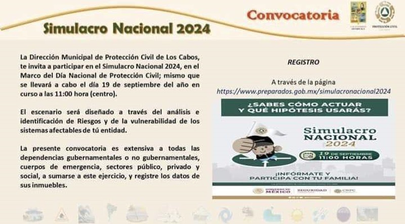 En México se llevará a cabo el Simulacro Nacional de Sismos 2024, por ello, el Gobierno de Los Cabos que preside Oscar Leggs Castro, invita a la población a participar el próximo jueves 19 de septiembre a las 10:00 de la mañana en este magno ejercicio preventivo que tiene como propósito difundir la cultura de la protección civil y concientizar a la ciudadanía sobre la importancia de la gestión de riesgos.