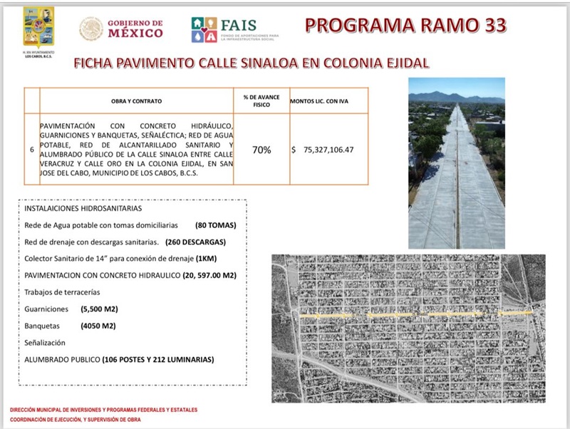 Además de la pavimentación de la calle Sinaloa, el servidor público mencionó que se están realizando otras obras en la colonia Vista Hermosa, en la calle Israel, así como la construcción de un parque en el fraccionamiento Monte Bello en San José del Cabo, lo que suma una inversión total de $205 millones 857 mil 707 pesos también a través del Ramo 33 del Gobierno Federal.