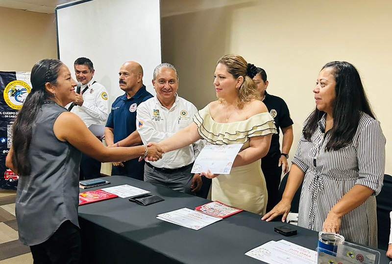 La novena regidora, Lorena Marbella González Díaz, presidenta de la Comisión Permanente de Protección Civil, del H. Cabildo de Los Cabos, en representación del presidente municipal, Christian Agúndez Gómez, y autoridades del H. Cuerpo de Bomberos de Cabo San Lucas, que encabeza el comandante Juan Antonio Carbajal, entregaron reconocimientos a las y los profesores de diferentes escuelas, luego de acreditar la capacitación “Aprende a Mantenerte Seguro”.
