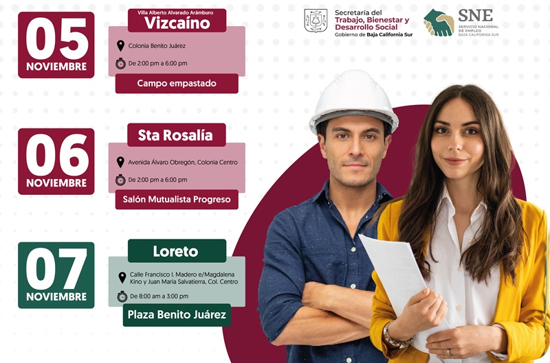 La Secretaría del Trabajo, Bienestar y Desarrollo Social (STByDS) a través del Servicio Nacional de Empleo de Baja California Sur (SNE-BCS) anunció que los días cinco, seis y siete de noviembre se estarán realizando jornadas de empleo al norte de la entidad, en el marco de la estrategia “La Chamba Nos Une”, que busca acercar opciones de empleo a las y los ciudadanos.