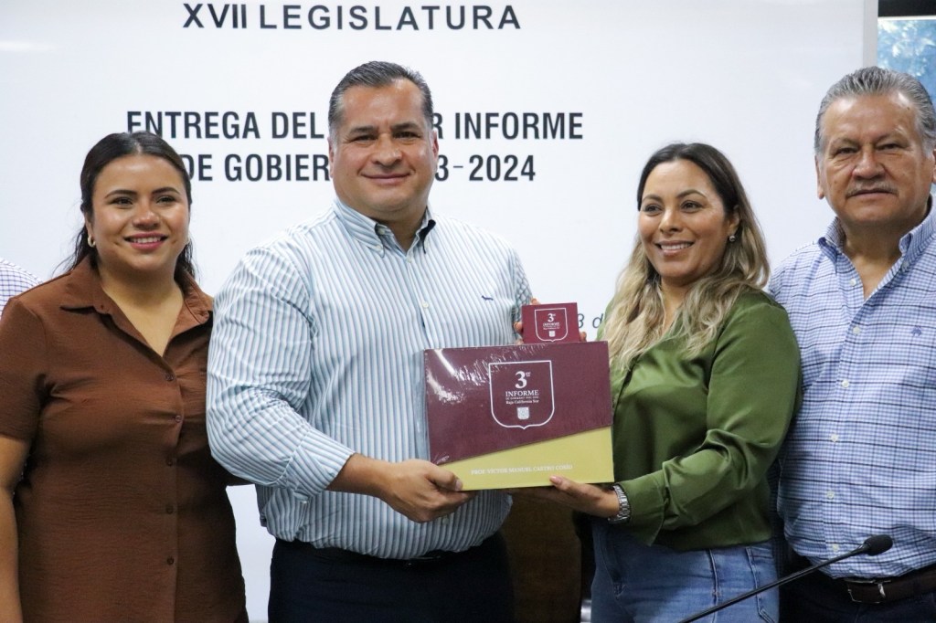 En cumplimiento al artículo 55 de la Constitución Política de Baja California Sur, el secretario General de Gobierno, José Saúl González Núñez, entregó la mañana de este miércoles a la Comisión del Congreso del Estado, encabezada por la diputada Lourdes Cornejo Rendón, vicepresidenta de la Mesa Directiva del Primer Periodo Ordinario de Sesiones de la XVII Legislatura, el documento que contiene el Tercer Informe de gobierno de la administración pública estatal.