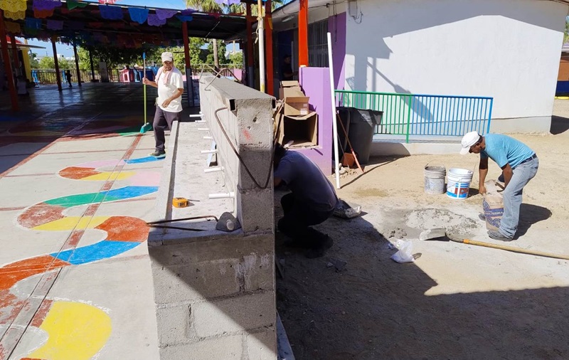 Como parte de los trabajos para el mejoramiento de los planteles escolares, el personal de la Coordinación de Obras Públicas realiza la construcción de bebederos con estructura de concreto en el preescolar “Guadalupe Libia Ceseña”, ubicada en la colonia 4 de Marzo, en la delegación de Cabo San Lucas. Esta institución educativa cuenta con una comunidad estudiantil de aproximadamente 100 niñas y niños.