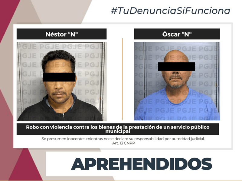 Luego de los trabajos de gabinete y campo la Procuraduría General de Justicia del Estado (PGJE), lograron la detención de dos personas del sexo masculino imputados por el delito de robo calificado por haberse cometido en contra de bienes afectando el servicio público municipal con violencia física y moral contra las personas, que probablemente cometieron la mañana del martes 3 de diciembre del año en curso en las oficinas del Sistema de Agua Potable y Alcantarillado de (SAPA), La Paz.