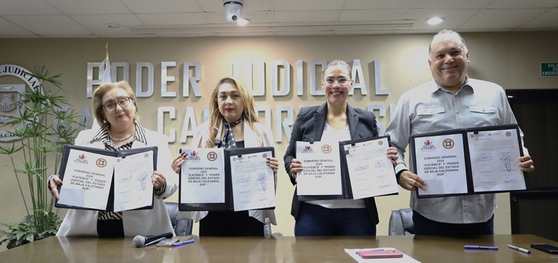 Con el objetivo de realizar actividades conjuntas en los campos de la capacitación profesional, con ello reforzar su desarrollo laboral, la titular del Instituto de Capacitación para los Trabajadores del Estado de Baja California Sur (ICATEBCS), Cinthya Fátima Montufas Chávez, y la Magistrada Presidenta del Tribunal Superior de Justicia del Estado (TSJE), Claudia Jeanette Cota Peña, firmaron un convenio de colaboración.
