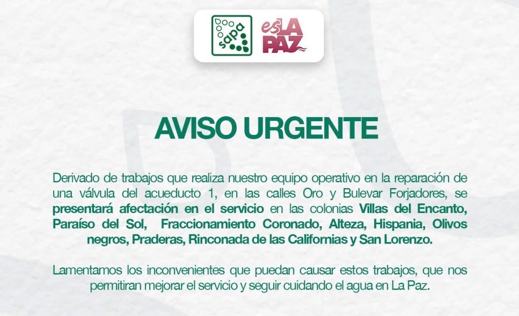 El Organismo Operador Municipal del Sistema de Agua Potable, Alcantarillado y Saneamiento (OOMSAPAS) de La Paz informó que debido a trabajos de reparación de una válvula en el acueducto 1, se presentarán afectaciones en el suministro de agua potable en diversas colonias de la ciudad.