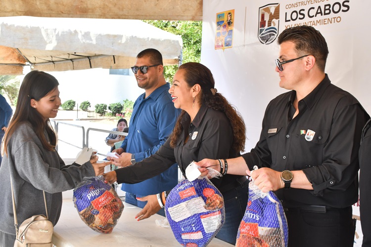 Por instrucciones del alcalde del XV Ayuntamiento de Los Cabos, Arq. Christian Agúndez Gómez,en ungesto de apoyo a las familias de Cabo San Lucas durante esta temporada navideña, la delegada municipal, Karina de la O Uribe, encabezó la entrega de pavos a mil 500 personas que se reunieron en la plaza pública León Cota Collins.