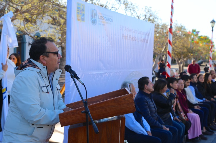 Los Cabos, Baja California Sur.- Este lunes 13 de enero, autoridades del XV Ayuntamiento de Los Cabos, encabezadas por el Quinto Regidor, realizaron una ceremonia cívica por el LVº (Quincuagésimo Quinto Aniversario) Aniversario Luctuoso del profesor Pablo L. Martínez, acto que se desarrolló en el marco de los honores a los Lábaros Patrios efectuados en la explanada frente a Palacio Municipal en San José del Cabo.