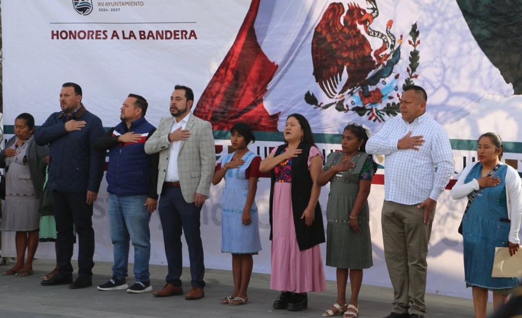 • Por primera vez, integrantes de la comunidad indígena forman parte del presídium junto al presidente municipal durante la ceremonia de Honores a la Bandera.