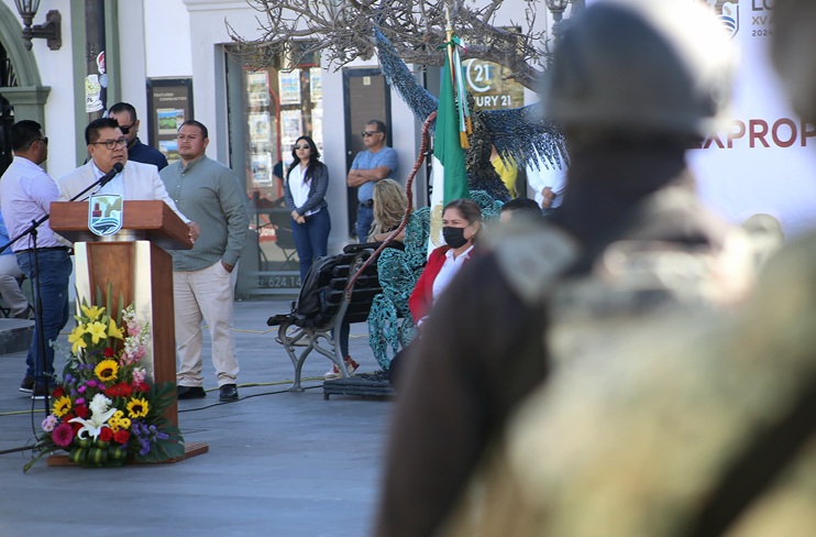 En representación del presidente municipal de Los Cabos, Christian Agúndez Gómez, el secretario general Alberto Rentería Santana dio la bienvenida a los asistentes, destacando la presencia de integrantes del Cabildo, representantes de las fuerzas armadas, directivos municipales y estudiantes del Colegio Ugarte.