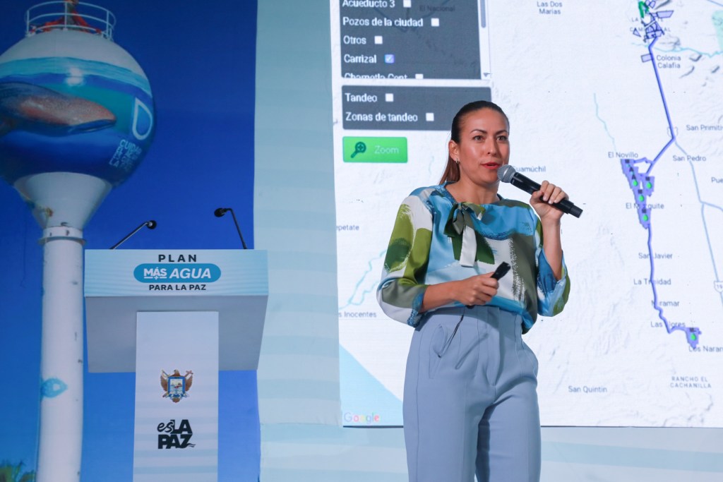 La Presidenta Municipal de La Paz, Milena Quiroga Romero, llevó a cabo la presentación del Plan Más Agua Para La Paz, una estrategia integral que resume las acciones emprendidas y proyectadas para mejorar el abastecimiento del vital líquido, cuidar el recurso y modernizar su manejo con apoyo de nuevas tecnologías y participación ciudadana.