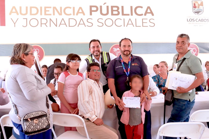 Con el objetivo de fortalecer el contacto directo con la ciudadanía y dar respuesta a sus necesidades, el presidente municipal de Los Cabos, el arquitecto Christian Agúndez Gómez y la presidenta honoraria del Sistema para el Desarrollo Integral de la Familia Sol Delgado Moreno, encabezaron la segunda Audiencia Pública y Jornada Social en la colonia Los Cangrejos de Cabo San Lucas, junto al cuerpo edilicio, la delegada municipal Karina Jesús de la O Uribe y personas del servicio público del XV Ayuntamiento de Los Cabos.