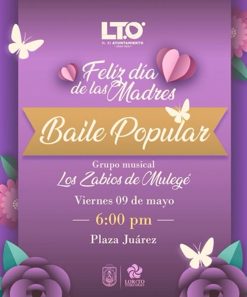 Luego de reconocer que las madres de familia, tienen un papel vital en la sociedad y la importancia de su participación en la vida pública y en el desarrollo de sus comunidades, la presidentamunicipal de Loreto Paz del Alma Ochoa Amador, invita a todas las mamás de Loreto a festejar su día la tarde de hoy viernes 9 de mayo con un gran baile popular en la plaza Benito Juárez