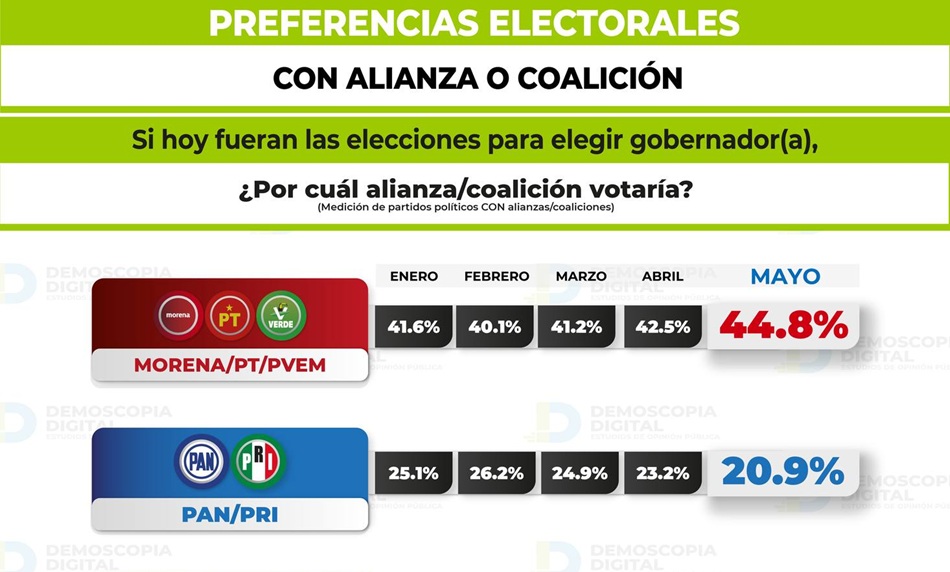 Hablando de partidos políticos, Morena y aliados llegó el mes pasado a registrar una preferencia electoral del 44.8%, muy por encima de su más cercano adversario PAN-PRI que registraron 20.9% de apoyo ciudadano. Movimiento Ciudadano y otros no llegan al 10% en la entidad.