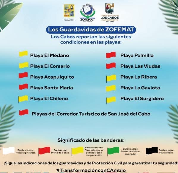 El titular de Zofemat Los Cabos reportó que las playas con presencia de banderas rojas son Acapulquito, Santa María, Palmilla, Las Viudas y playas del corredor turístico en San José del Cabo, indicativo de que se prohíbe el ingreso.