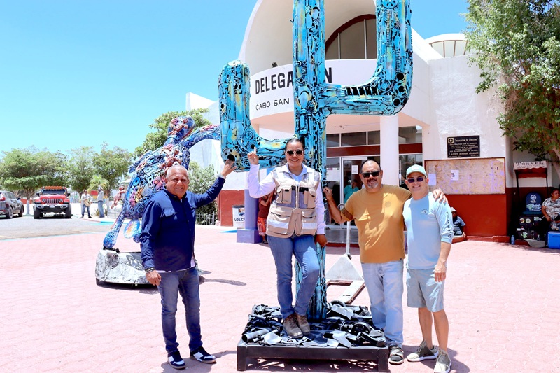 La delegada de Cabo San Lucas, Karina de la O Uribe recibió al escultor Juan Sotomayor, quien entregó una serie de esculturas elaboradas con material reciclado, las cuales ya se encuentran en exhibición en la entrada del edificio delegacional. Entre ellas destacan un cactus y una tortuga.