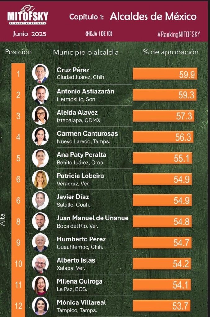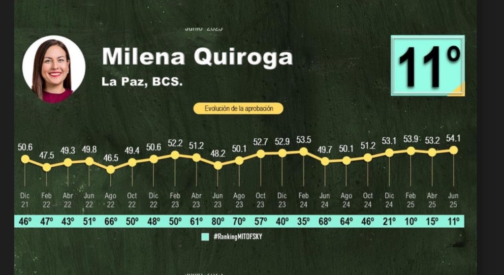 La alcaldesa de La Paz, Milena Quiroga, se mantiene en el top de alcaldes y alcaldesas mejor evaluadas de México, calificada con un 54.1% de aprobación ciudadana según los resultados de la encuesta de Consulta Mitofsky realizada en junio del 2025.