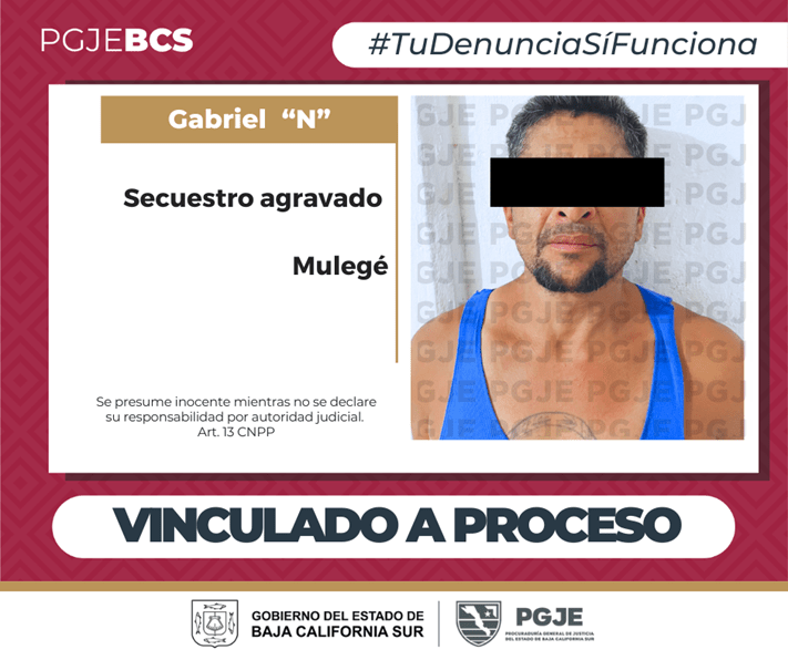 La Procuraduría General de Justicia del Estado (PGJE) de Baja California Sur, obtuvo vinculación a proceso en contra de Gabriel “N”, alias “El Berrendo”, por su probable responsabilidad en el delito de secuestro agravado, derivado de hechos ocurridos en 2018 en el municipio de Mulegé.