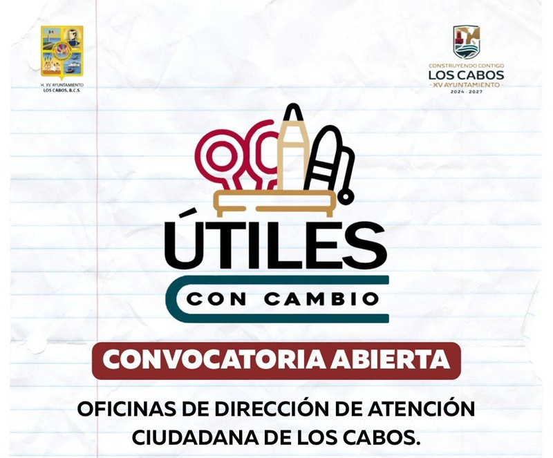 Con el objetivo de respaldar a las familias cabeñas en el inicio del nuevo ciclo escolar, el XV Ayuntamiento de Los Cabos, a través de la Dirección Municipal de Atención Ciudadana, invita a madres, padres y tutores a inscribirse en la campaña “Útiles con Cambio”, mediante la cual se entregarán paquetes escolares a niñas, niños y jóvenes del municipio.