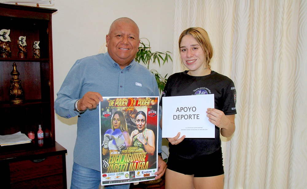 En representación de la delegada de Cabo San Lucas Karina de la O Uribe, el coordinador de la Secretaría General, Víctor Castro Martínez recibió a la boxeadora profesional Edén Inairam Villavicencio Aguirre, conocida como “La Muñeca”, a quien entregó un apoyo económico para su preparación física de cara a su próxima pelea que se llevará a cabo el sábado 06 de septiembre.