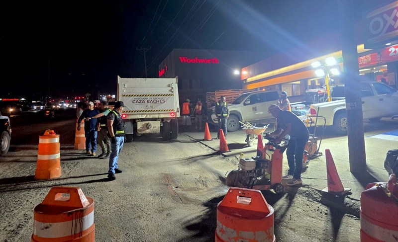 – El XV Ayuntamiento de Los Cabos, a través de la Dirección General de Obras Públicas y Asentamientos Humanos, realiza trabajos de bacheo esta noche en la Delegación de Cabo San Lucas, con labores que forman parte del programa de mantenimiento vial “Caza Baches”, que tiene como objetivo mejorar las condiciones de circulación en las zonas más afectadas.