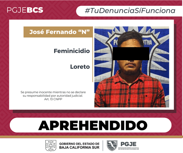 Derivado de labores de investigación y seguimiento ministerial, agentes de la Subprocuraduría de Atención a Delitos de Alto Impacto (SADAI) de la Procuraduría General de Justicia del Estado (PGJE) de Baja California Sur, cumplimentaron el 5 de noviembre una orden de aprehensión por el delito de feminicidio en contra de José Fernando “N”, de 23 años de edad.