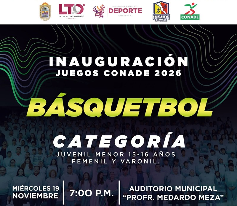 El XI Ayuntamiento de Loreto invita a la ciudadanía a la inauguración de los Juegos de Básquetbol CONADE 2026, categoría 15–16 años, a celebrarse este miércoles 19 de noviembre a las 7:00 de la tarde en el Gimnasio Auditorio Medardo Meza Domínguez, donde Loreto será sede oficial.