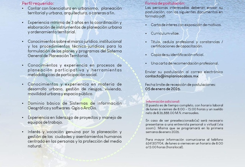 - Las personas interesadas deben enviar su postulación en formato PDF al correo contacto@implanloscabos.mx