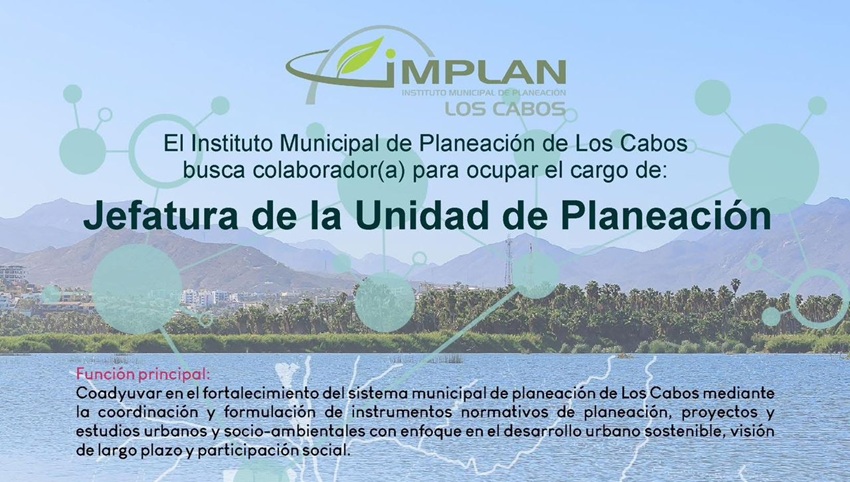 Con el objetivo de fortalecer el sistema municipal de planeación y los procesos técnicos que contribuyen al desarrollo urbano del municipio, el XV Ayuntamiento de Los Cabos, publicó la convocatoria emitida por el Instituto Municipal de Planeación (IMPLAN) para ocupar la Jefatura de la Unidad de Planeación.
