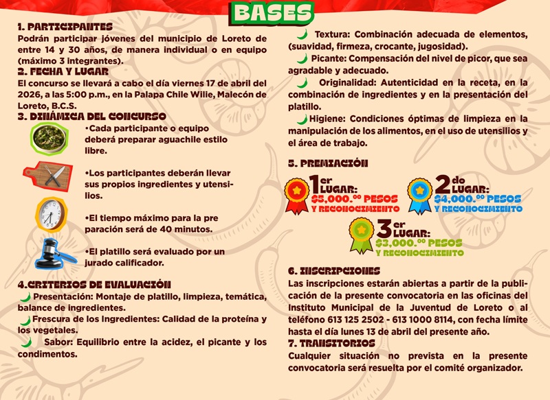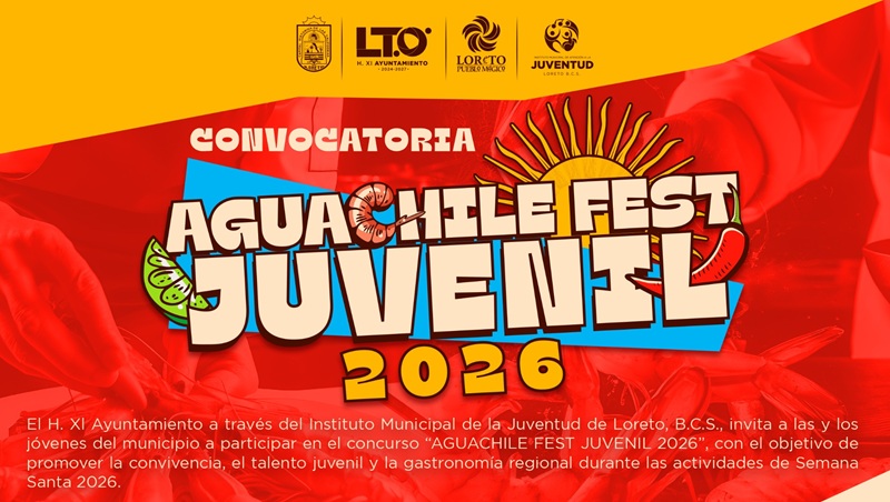 Como parte de las actividades encaminadas a fortalecer la convivencia, el talento juvenil y la gastronomía regional, el XI Ayuntamiento de Loreto, a través del Instituto Municipal de Atención a la Juventud (IMAJ), lanzó la convocatoria para participar en el concurso “Aguachile Fest Juvenil 2026”.