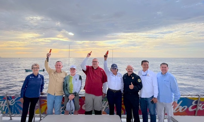 En representación del alcalde de Los Cabos, Christian Agúndez, el director general de Desarrollo Social, Carlos Castro Ceseña, estuvo presente en el disparo de salida del Torneo de Pesca Bulnes 2026, en la bahía de Cabo San Lucas, donde estuvo acompañado por la delegada municipal de Cabo San Lucas Karina de la O Uribe y el director municipal de Pesca Juan Javier García.